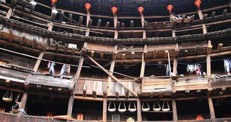 这是一栋圆形的建筑物,规模比较大,有好几层,而且这里生活了很多户人家,大家的门前都挂上了鲜艳的红灯笼。让这栋饱经岁月洗礼的古建筑也拥有了一丝活力。大家抬头看到的景象也是非常迷人的,这是圆形的建筑,建筑物顶端就像是一个大大的圆圈,而蓝天白云就出现在这个圆圈当中。